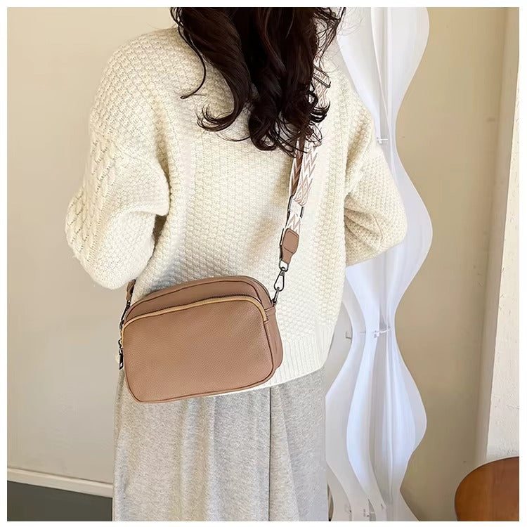 Il design neutro ed elegante del corpo borsa si abbina facilmente, mentre la tracolla aggiunge un tocco di personalità unico. È l'accessorio perfetto che unisce praticità, comodità e stile.
